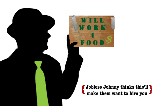 Jobless Johnny decided to go against the grain on this one, despite normally following the Cookbook’s “advice.” He didn’t see how appearing well fed would get anyone to hire him and decided that adding a “will work 4 food” sign to his interview attire was actually a great idea. So far, he’s been mistaken for a homeless man and thrown out of every interview he’s tried applying for. Johnny’s resilient though, and he’s going to keep on trying.